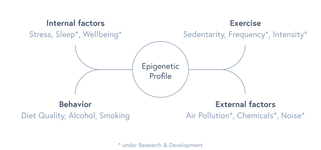 Those influences can be summarized in an Epigenetic Profile – how much older or younger you are, offering you an insight on how healthily you will age.